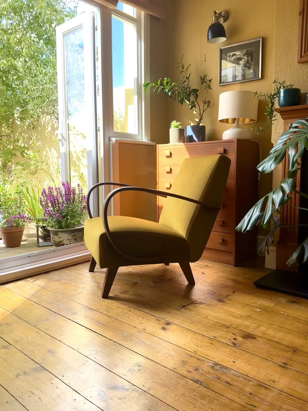 This vintage bentwood armchair has been professionally restored and reupholstered in rich, thick mustard velvet.