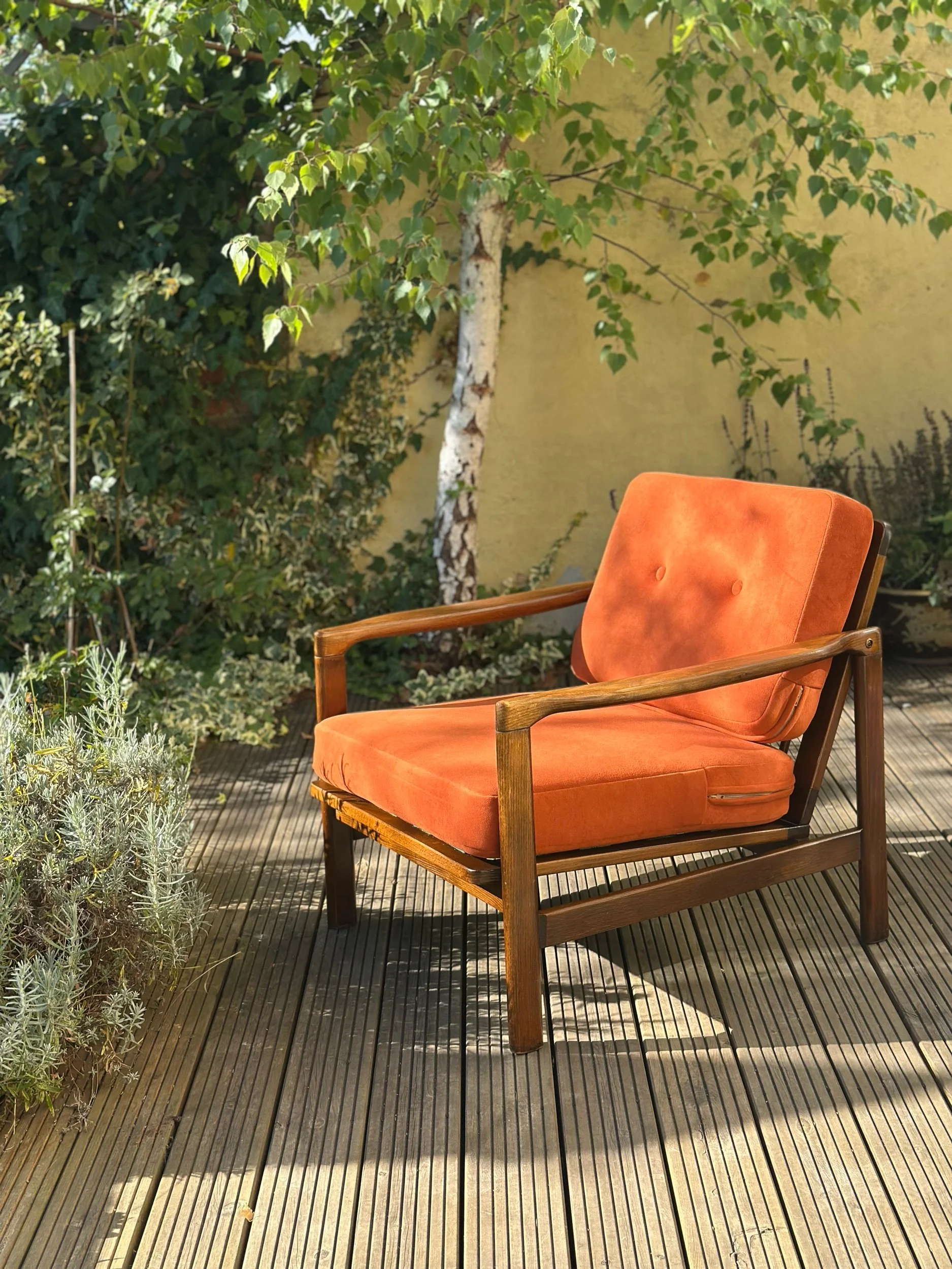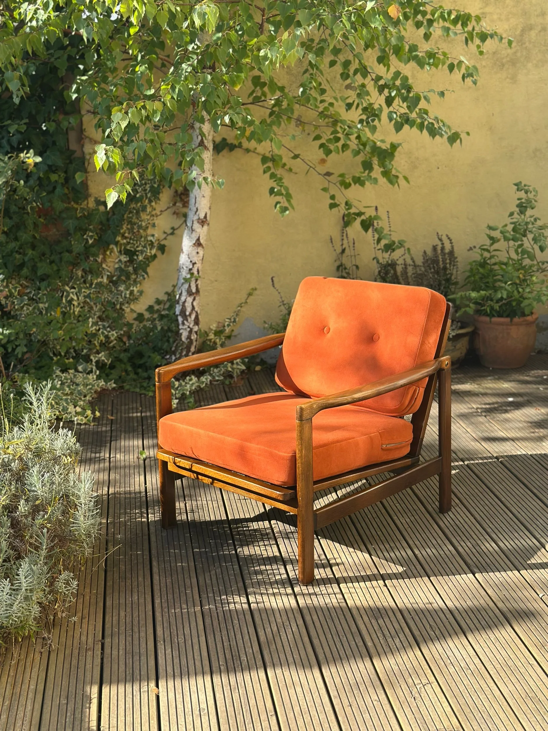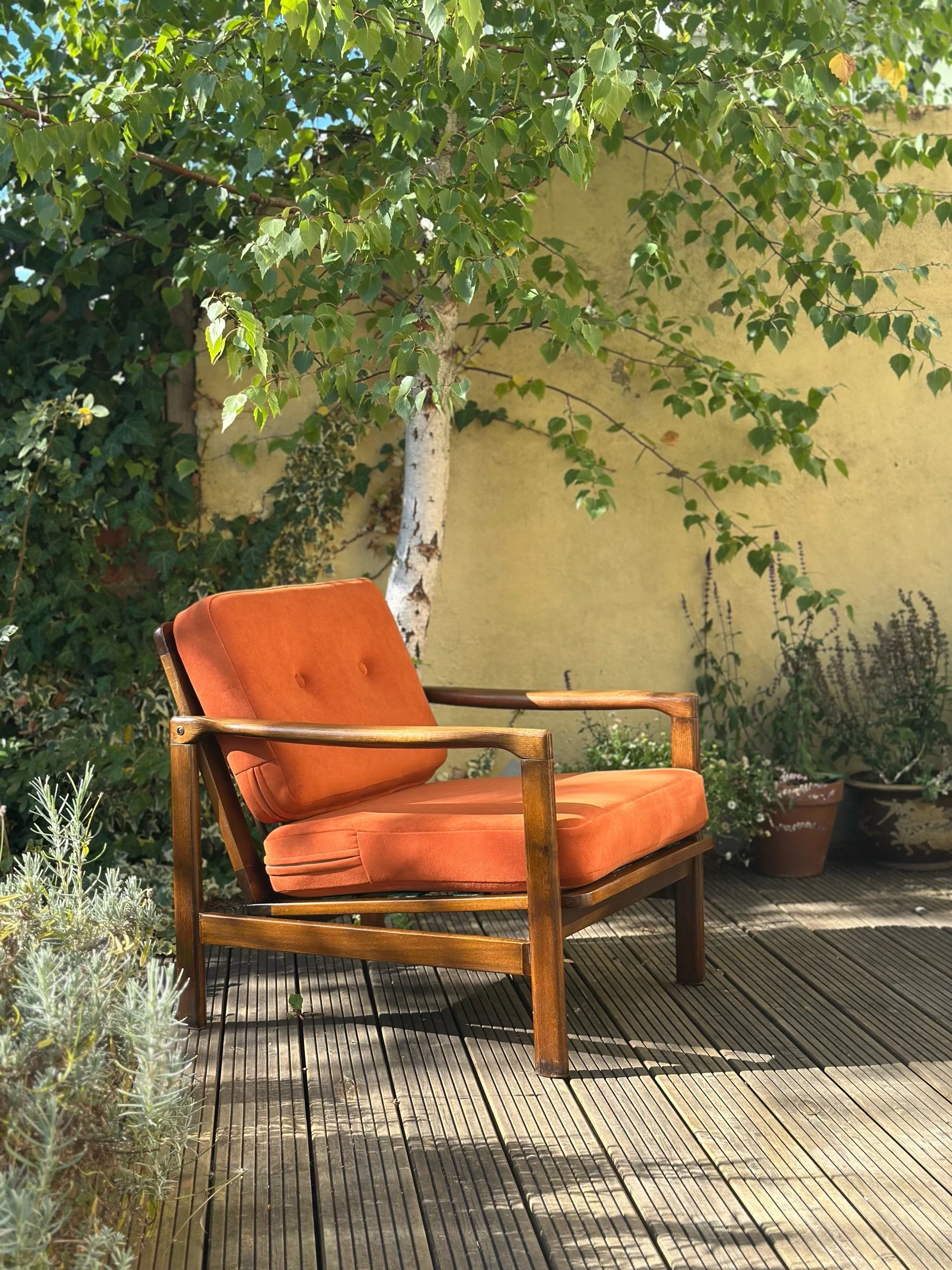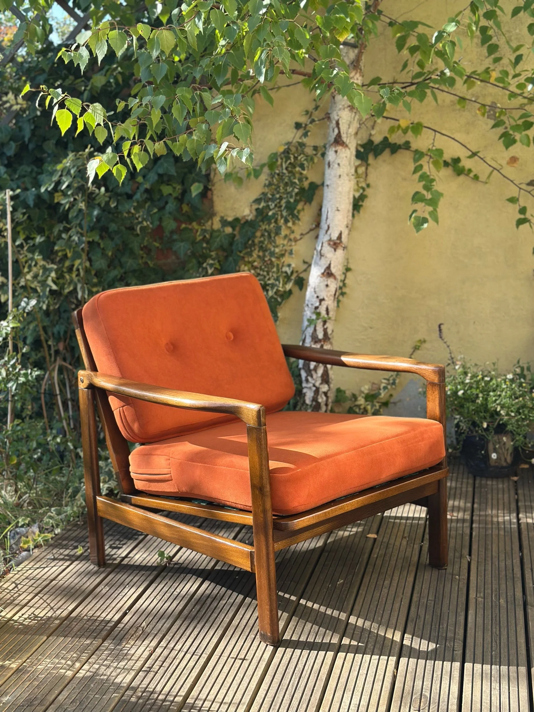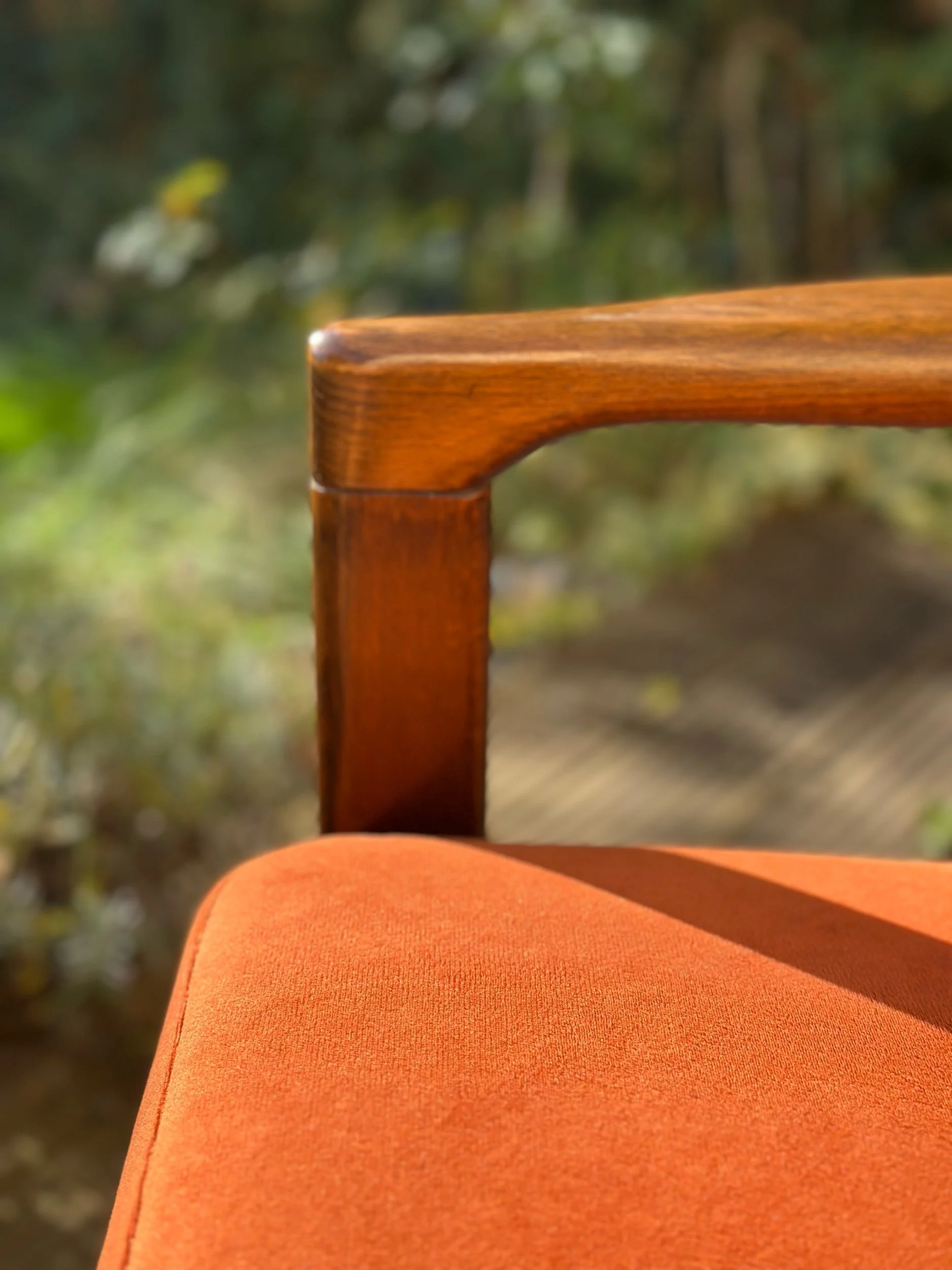 This stunning vintage lounge chair has been fully restored and reupholstered in a beautiful, thick velvet in rust/terracota. We use only OEKO-TEX® certified fabrics – safe for you and the planet.